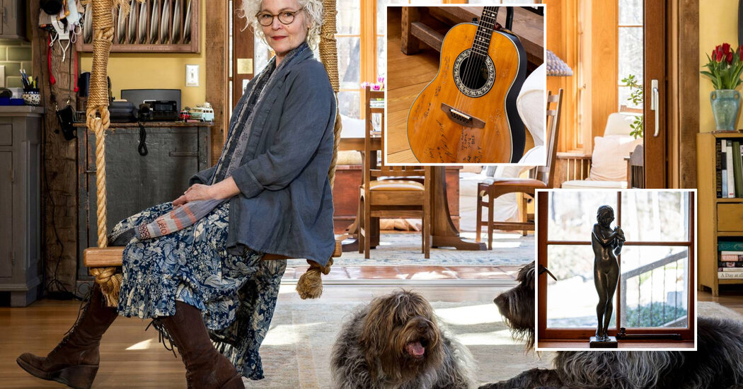 Amy Irving posa en un columpio suspendido de un rayo de techo en un área de sala de estar rústica. Dos perros grandes y esponjosos están a su lado.