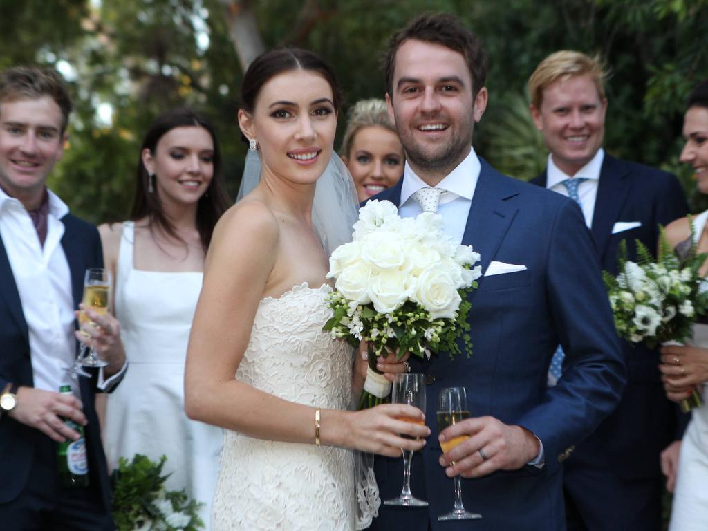 Jeremy y Olivia Bond el día de su boda en 2013 en Peppermint Grove, Perth.