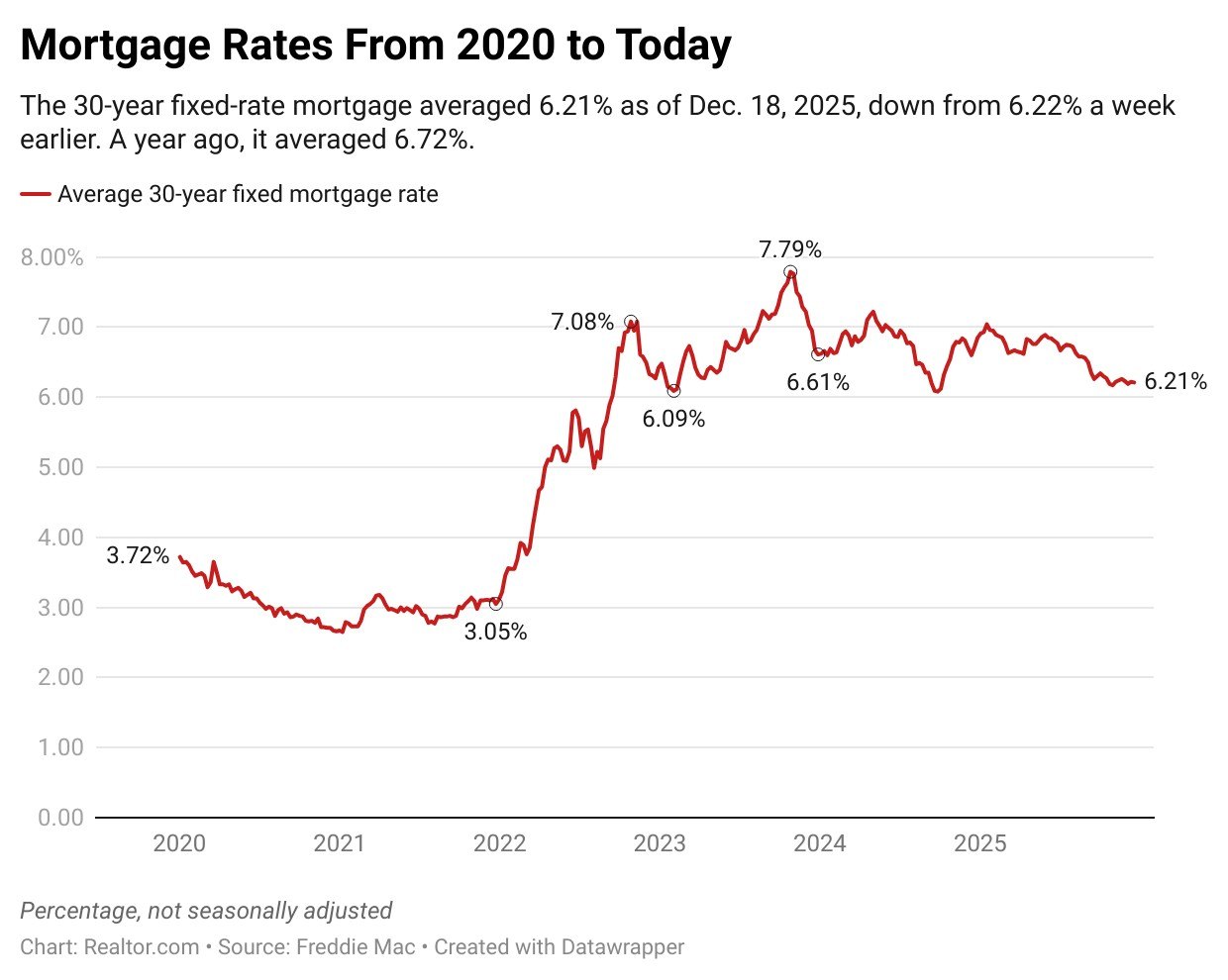 Incluso antes de estos datos, tasas hipotecarias se mantuvieron esencialmente sin cambios, cayendo sólo 1 punto básico esta semana. Esta estabilidad ha facilitado a los compradores la elaboración de presupuestos y, afortunadamente, para quienes compran una vivienda como resolución de Año Nuevo, el agente inmobiliario.comEl pronóstico de vivienda ® anticipa que las tasas hipotecarias continuarán más o menos como están hasta 2026.