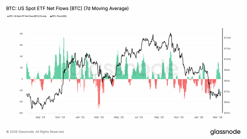 Como muestra el siguiente gráfico, los ETF de BTC experimentaron salidas netas desde octubre de 2025, como lo indican las barras rojas en la parte inferior derecha del gráfico; sin embargo, en febrero y marzo de 2026 se observaron importantes barras verdes, lo que indica un renovado interés institucional en BTC. Queda por ver si esta tendencia continuará.